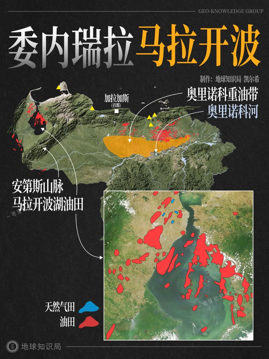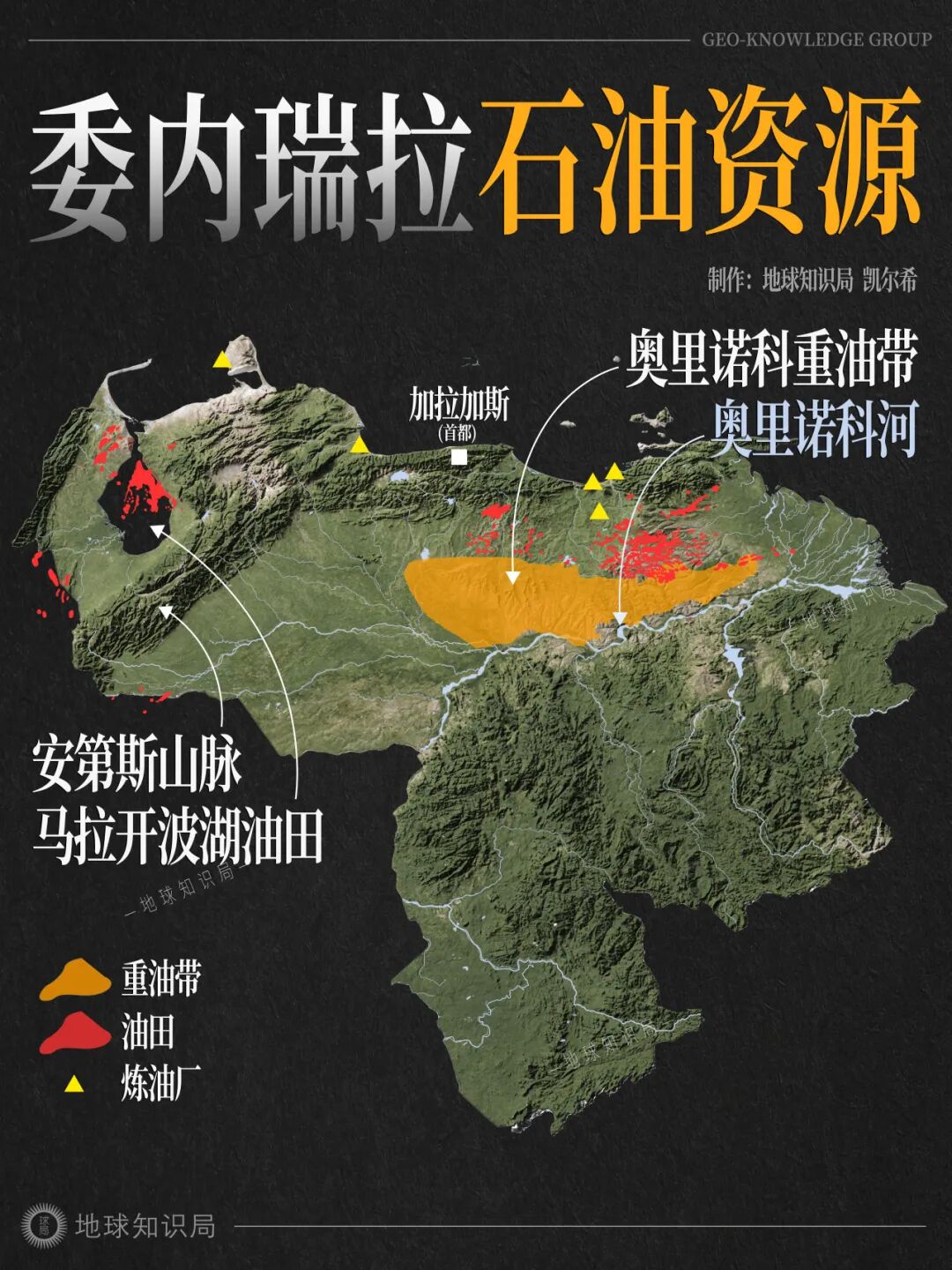 委内瑞拉的主要油田分为两大区域:西部是马拉开波湖油田群,东部则是奥里诺科重油带,后者是全球最大的重油、超重油聚集区。
