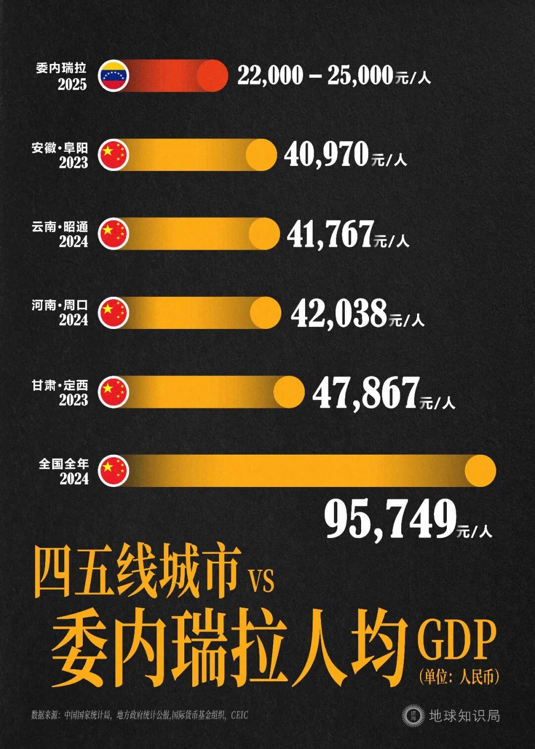 近五年间,委内瑞拉的人均GDP始终在3000至4000美元之间徘徊。即便放在中国国内,这一水平也明显低于阜阳、昭通、周口、定西等城市。