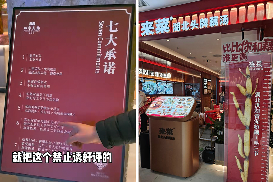 依赖技巧的虚假繁荣退潮,专注内功的长期主义凸显。率先转变思路的商家已获积极反馈:四季民福设置“举报要好评”提示牌,奖励1万元举报金,专注提升产品服务;来菜把差评当“镜子”,梳理建议并改进,未刻意邀评仍实现星级提升。