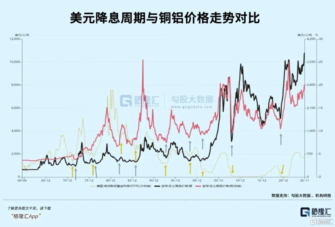 机构研报指出,1960年以来,有色金属波动与美元降息周期契合,利率底部后往往出现上涨。当前美元降息推动流动性宽松,叠加新能源、新能源车及AI算力需求爆发,带动有色金属需求增长,成为景气周期的根本因素。