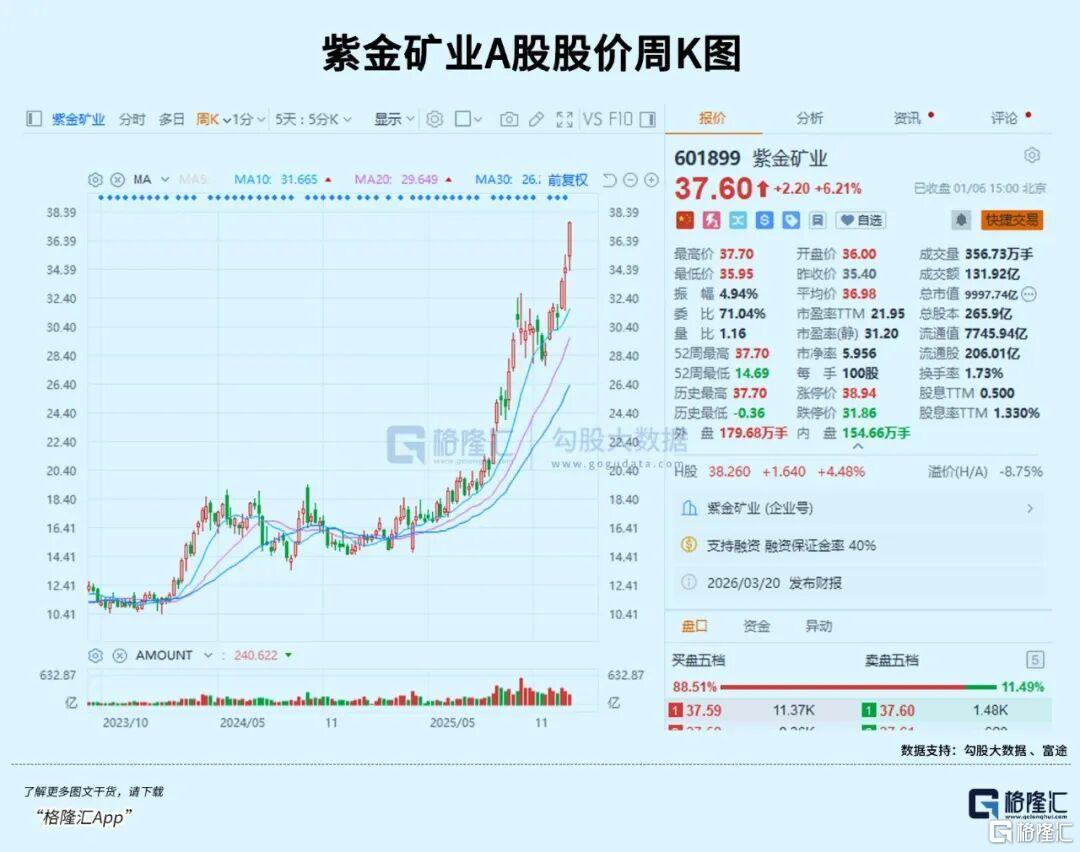 今日,连续三年强势上涨的中国“金铜双冠王”紫金矿业盘中大涨6.5%,最高价达37.7元,市值突破1万亿元,成为A股第15家、有色行业唯一的万亿市值公司。