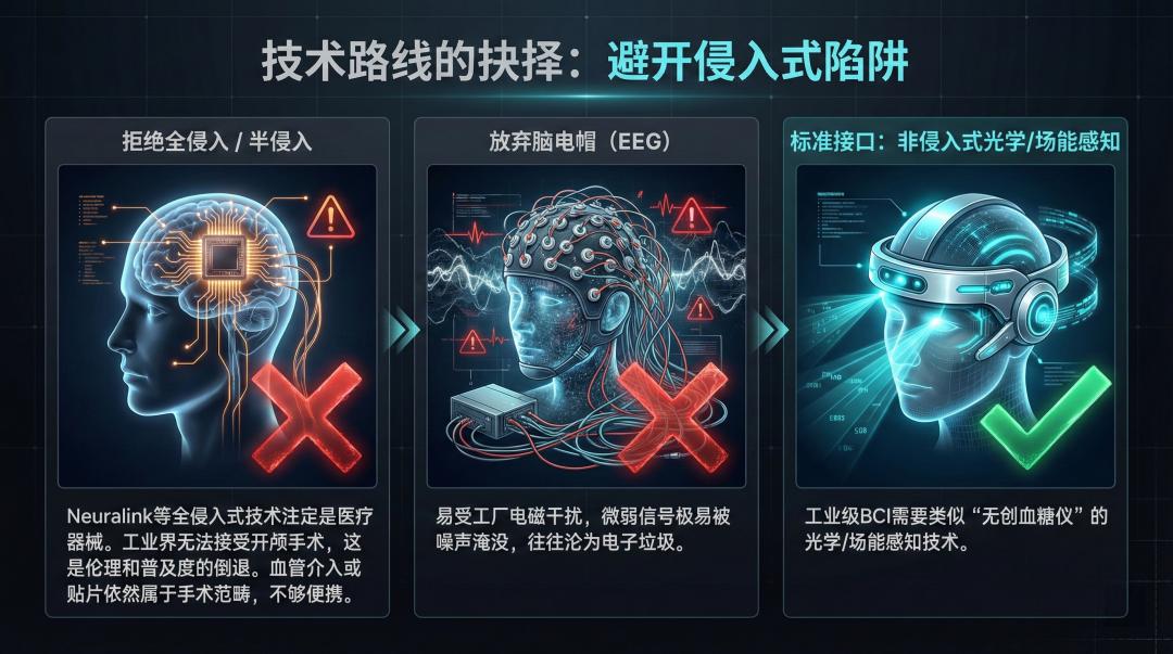 试想,如今血糖仪已进化到利用光学或射频传感,无需扎破手指就能精准监测血糖;若要求工人在大脑或血管植入芯片才能工作,在伦理和普及度上无疑是技术倒退。