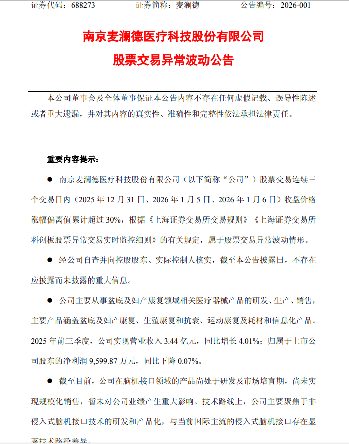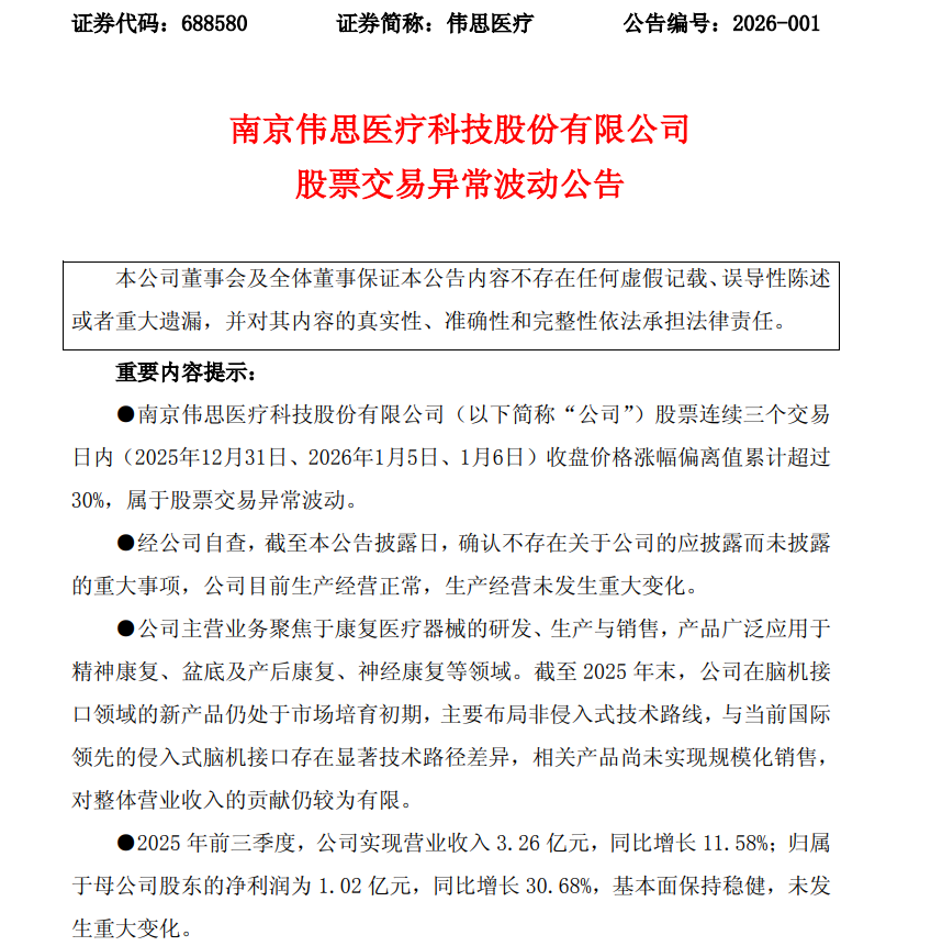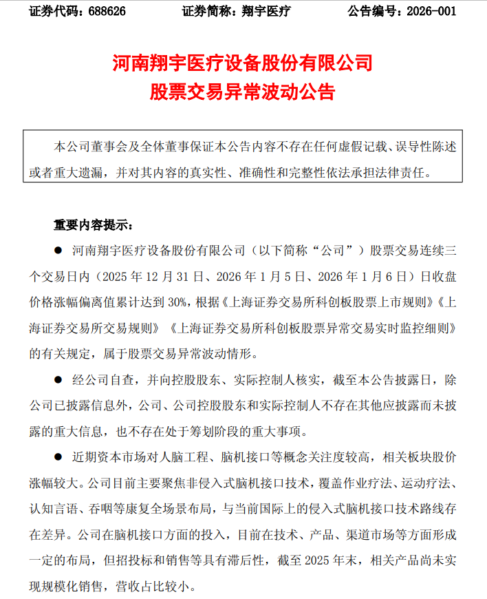 近日,脑机接口等相关概念股迎来持续上涨行情。到1月6日时,已有多只概念股连续三个交易日的收盘价涨幅偏离值累计达到30%。针对这一情况,多家上市公司在1月6日晚间发布了股票交易异常波动公告,说明公司在脑机接口领域的新产品还处于市场培育的初期阶段,并且和国际主流技术路径有着显著差异。