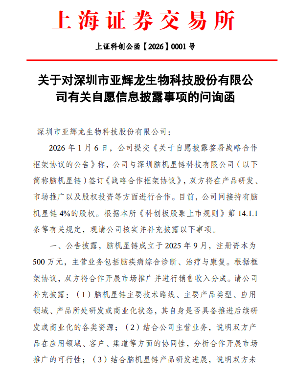与此同时,上交所也采取了行动,1月6日向亚辉龙发出了问询函,要求公司对披露的战略合作框架协议进行补充披露。之前在1月5日晚间,亚辉龙发布公告称,公司和深圳脑机星链科技有限公司(以下简称“脑机星链”)签订了《战略合作框架协议》,双方将在产品研发、市场推广以及股权投资等方面展开合作。目前,公司间接持有脑机星链4%的股权。上交所的问询函要求亚辉龙补充披露脑机星链的主要技术路线、主要产品类型、应用领域、产品所处的研发或商业化状态,脑机星链自身是否具备推进后续研发或商业化所需的各类资源,以及公司未来拟对脑机星链进行股权投资或资金支持的具体安排和形式等内容。