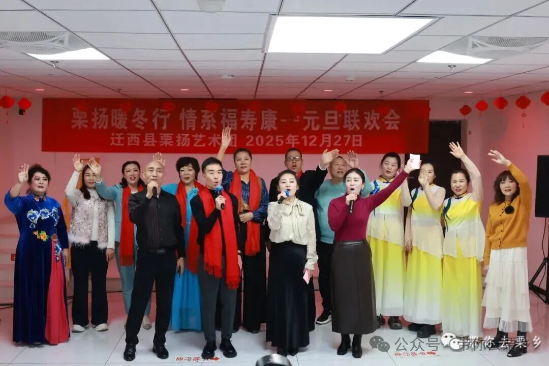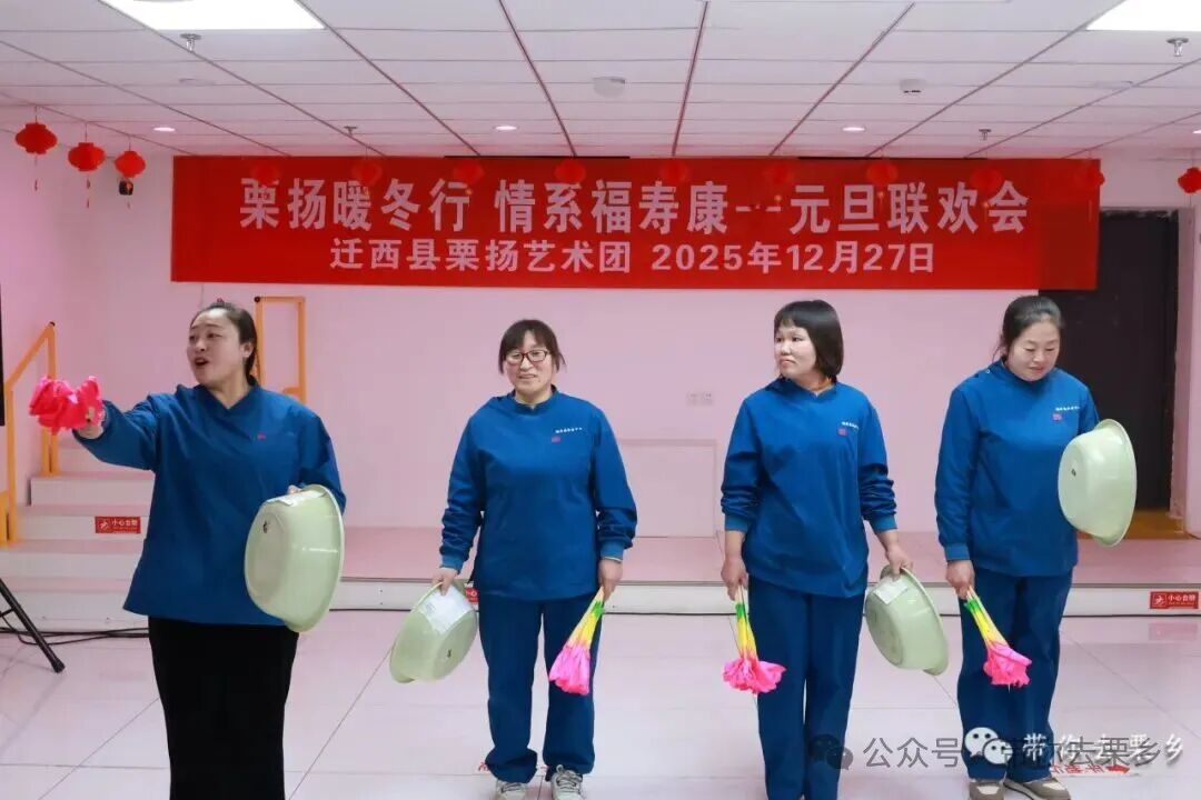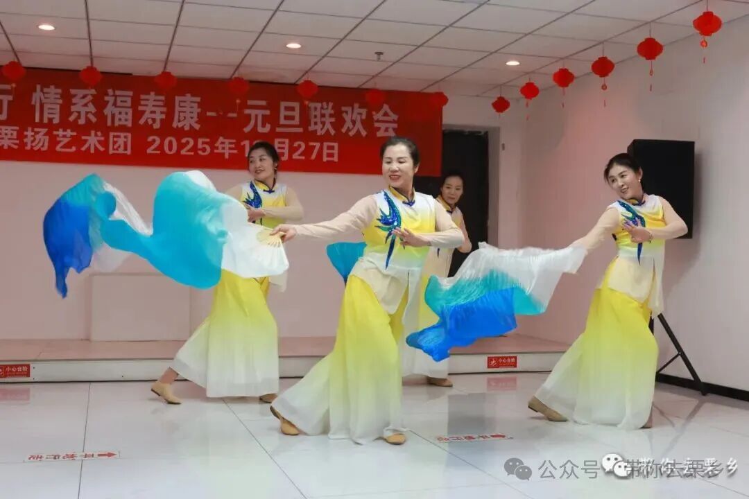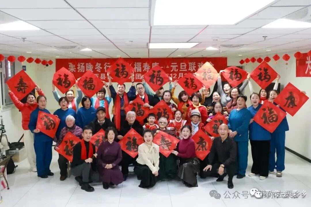 天花板上挂满了一盏盏红色小灯笼,喜庆的节日气息瞬间弥漫开来。栗扬艺术团的成员们怀揣着真挚的心意与美好祝福走进这里,和老人们一起写福字、包饺子、欣赏节目,在一片欢声笑语中共同度过了一段温馨祥和的新年时光。