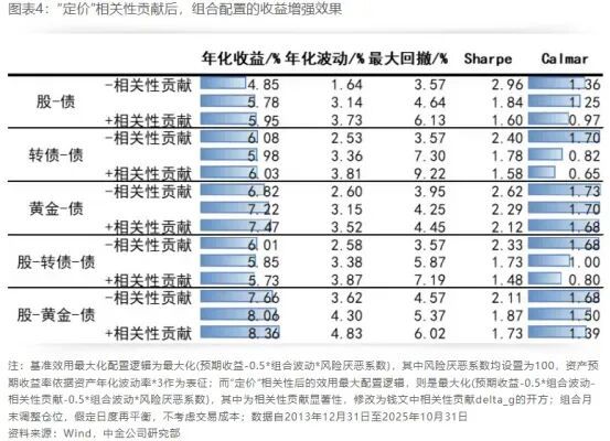 但若在股债组合中加入黄金,年化收益会显著提升:“负相关性贡献”可达7.66%,“正相关性贡献”甚至能到8.36%。