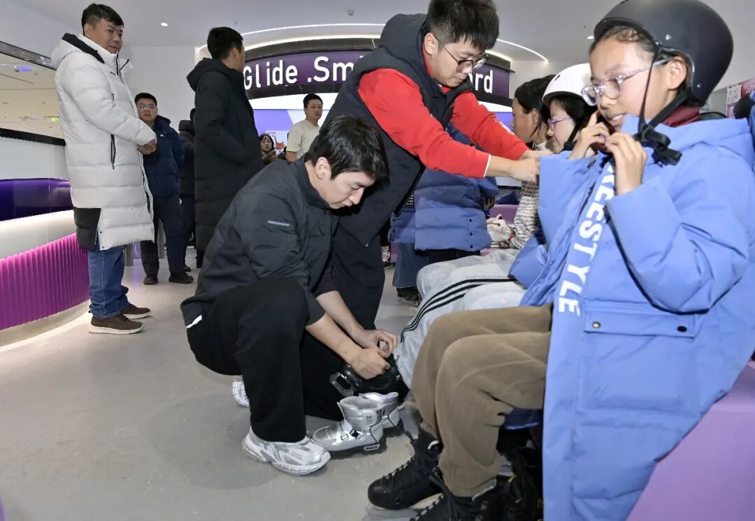 在武大靖团队的指导下,小记者们认真穿戴护具、系紧冰鞋。武大靖和教练们还俯身仔细检查每个孩子的装备,轻声鼓励的话语,缓解了大家初上冰场的紧张。基地里的少数民族小队员与小记者们结对,用同龄人的方式分享滑冰技巧,帮助他们走进冰场。