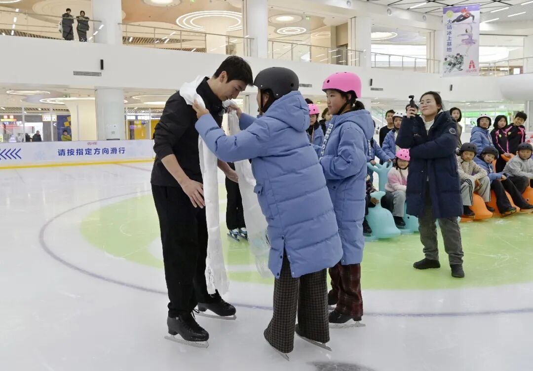 自由体验时,孩子们围着武大靖问出各种问题:“滑冰摔倒了怎么站起来?”“成为奥运冠军要练多久?”武大靖耐心解答,还牵着他们的手帮助保持平衡,指导滑行。从蹒跚学步到慢慢滑稳,孩子们的脸上渐渐露出自信的笑容。武大靖分享自己的经历:“我刚学滑冰时也常摔倒,重要的是每次都要站起来,梦想需要用汗水浇灌。”