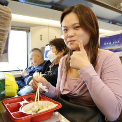 “这是我第一次吃高铁热链盒饭,感觉特别好。我平时喜欢吃辣,对广东人来说这个辣度刚好,主菜好吃,搭配的泡菜很开胃,青菜也格外新鲜”