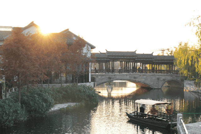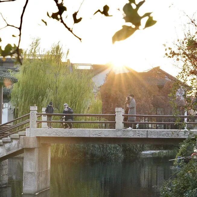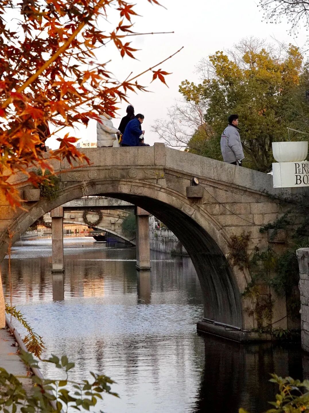 踏上香花桥驻足远眺,河水映着天色与岸边屋瓦,清浅中泛着淡淡的灰蓝。桥边的树木还未完全褪去色彩,叶片带着深绿、锈红与暖黄,像是被冬天轻轻吻过,色彩层次分明却不张扬。几片叶子零星飘落水面,漾开浅浅涟漪,时光仿佛也慢了下来。