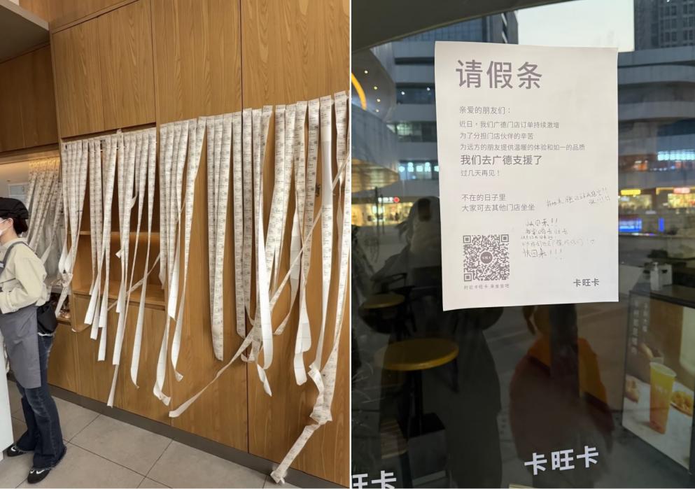 为应对单量爆发,卡旺卡从安徽全省调集200多名员工支援广德,合肥多家门店贴出“请假条”。12月20日,广德店创下22862杯的吉尼斯纪录,元旦订单持续贴满整墙。