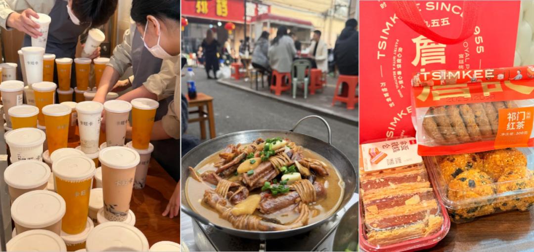 马路边食客摩肩接踵,奶茶店取号量破万,桃酥铺前长龙蜿蜒。