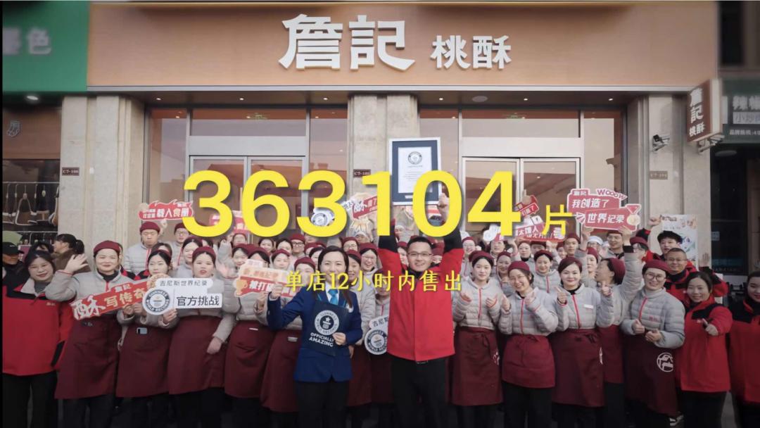 “三件套”爆火后,詹记从全国抽调近200名员工支援广德店,合肥工厂开启24小时运转保障供货。1月1日,詹记广德店桃酥销量达363104片,同样申请了吉尼斯世界纪录。