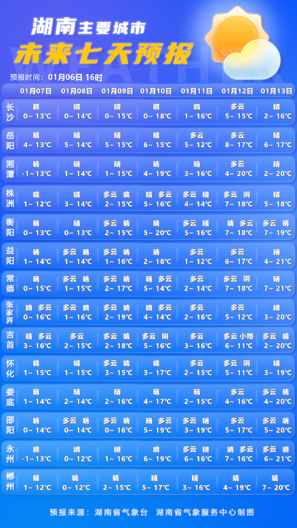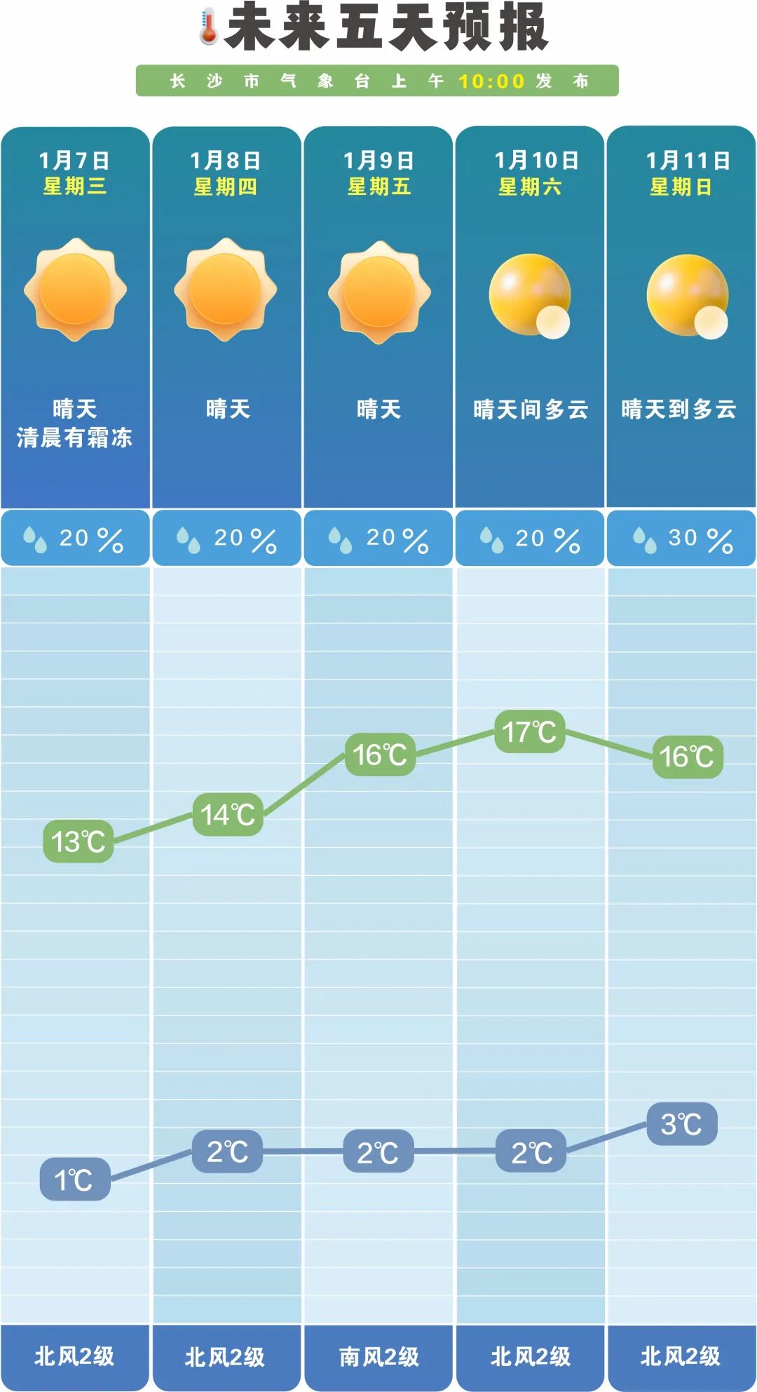 1月7日白天,晴天间多云,湘西、湘北清晨部分地区有雾;北风2~3级;最低气温-2~0℃;最高气温15~17℃。