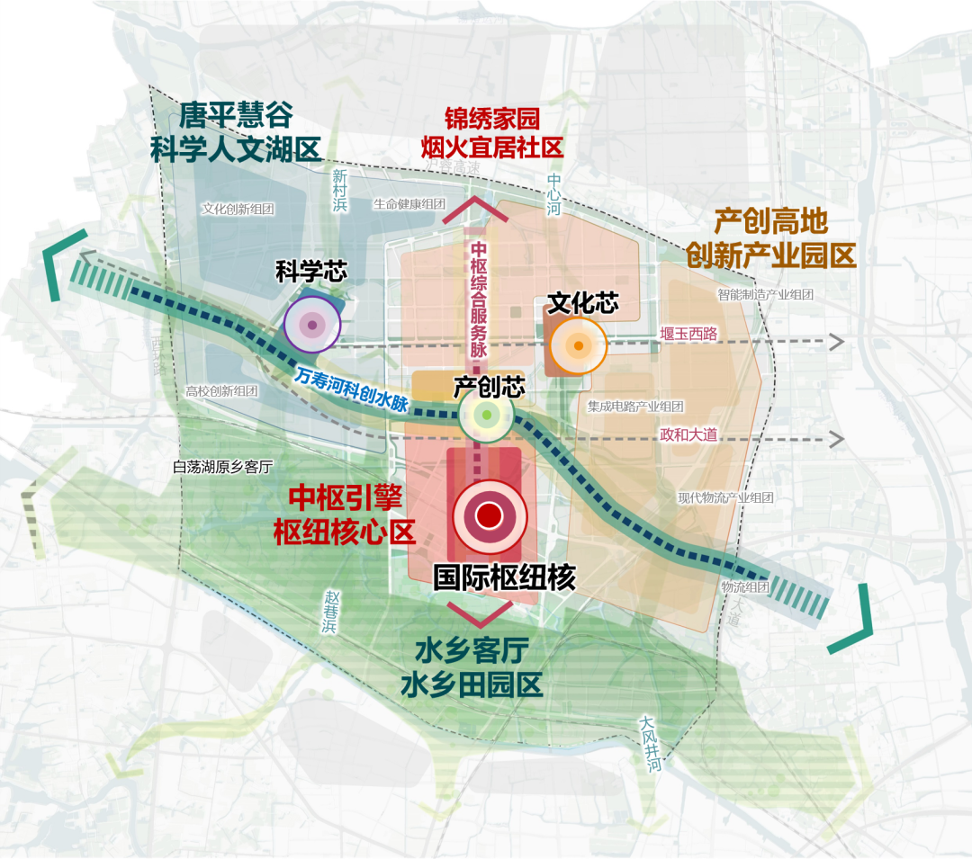 《城市设计》重点聚焦3.8平方公里的核心区,强化“高效可达、站城一体、功能协同、蓝绿为脉”的理念,形成“一核三芯、双脉涟洲、五片共耀”的空间结构,打造集长三角中轴枢纽、锡西服贸平台和芙蓉湖水乡客厅为一体的枢纽引擎典范。