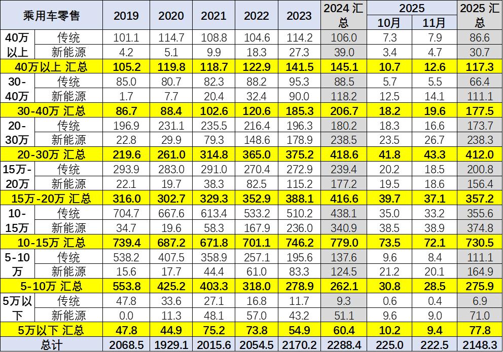 乘联会的数据显示,2025年前11个月,15万元以下的汽车销量比重从2024年的48%上升到了51%,其中新能源的占比涨幅超过10%,远超其他价格段车型,且在所有新能源车中的比重超过53%。