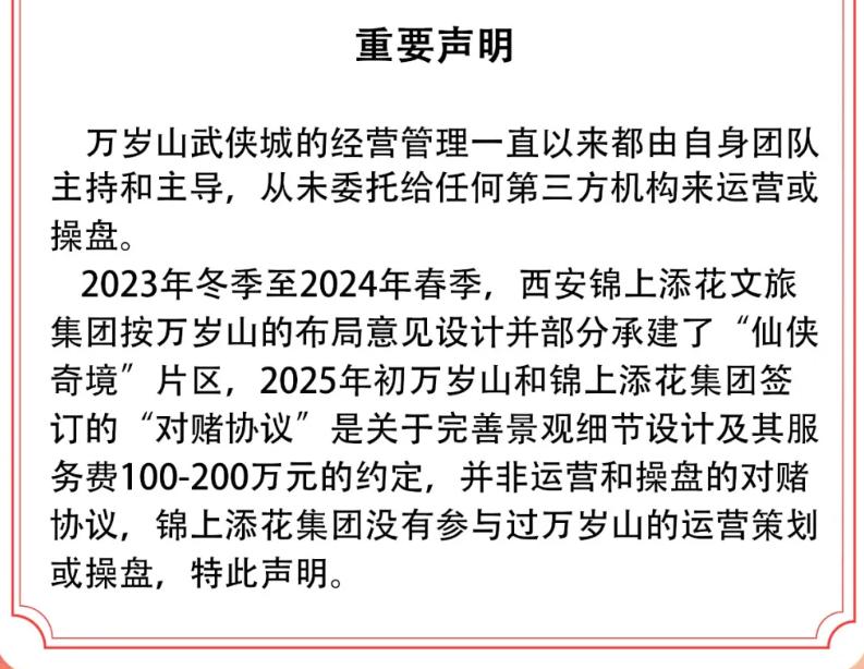 2026年初,开封万岁山武侠城的一份年度经营数据报告,因文末声明将西安锦上添花文旅集团推向舆论风口。声明明确否认委托第三方运营操盘,称网传“百亿流量操盘手”及对赌协议实为“景观细节设计服务费100-200万元的约定”,引发外界对锦上添花“假对赌”的质疑。