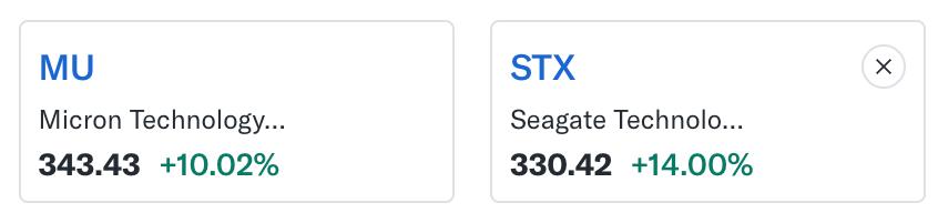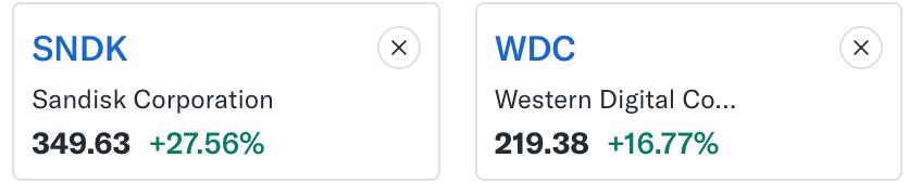 收盘时,闪迪(SNDK)暴涨27.56%,美光(MU)上涨10.02%,西部数据(WDC)大涨16.77%,希捷(STX)也攀升14%,均实现两位数涨幅。