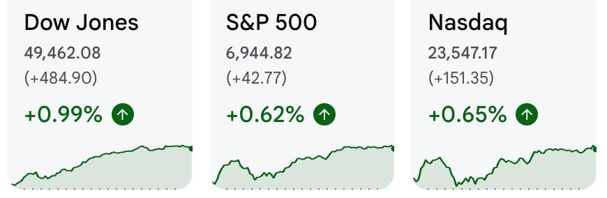截至收盘,道指上涨0.99%,收于49462.08点,历史性突破49000点关键心理关口;标普500指数同步创下纪录,收涨0.62%至6944.82点。