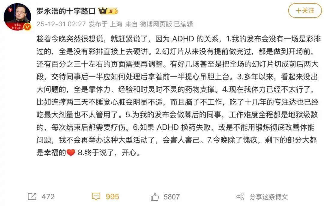 在迟到了40分钟后,罗永浩终于在2025年的最后一天,登上了科技春晚的舞台。对于那些苦等许久的现场观众,他给出的补偿除了免票,还有一个“理由”:ADHD。