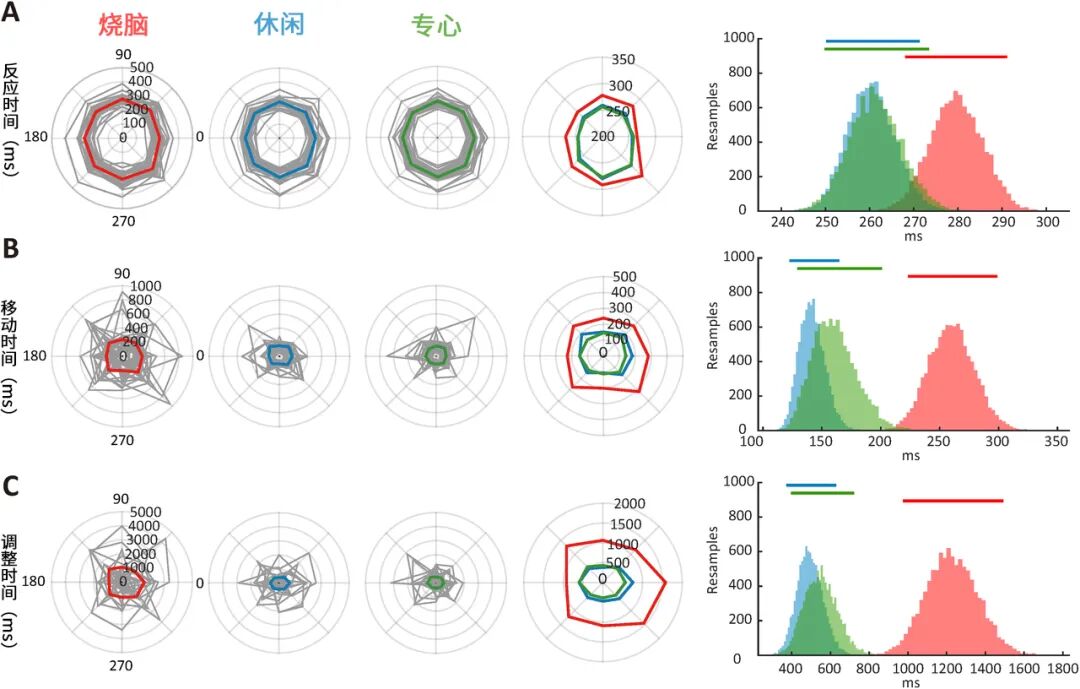 左图-灰线代表单个参与者数据,红线、蓝线、绿线分别为烧脑、休闲、专心组平均值;右图-数据分布估计(烧脑组平均用时高于另两组)| 参考文献[1]