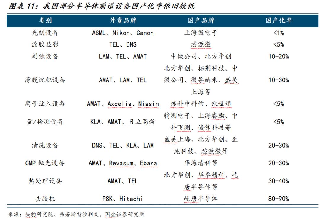 国金证券在研报中指出,上游细分领域的国产化率仍有较大提升空间,如刻蚀设备国产化率仅10%-20%,清洗设备国产化率仅20%-30%。