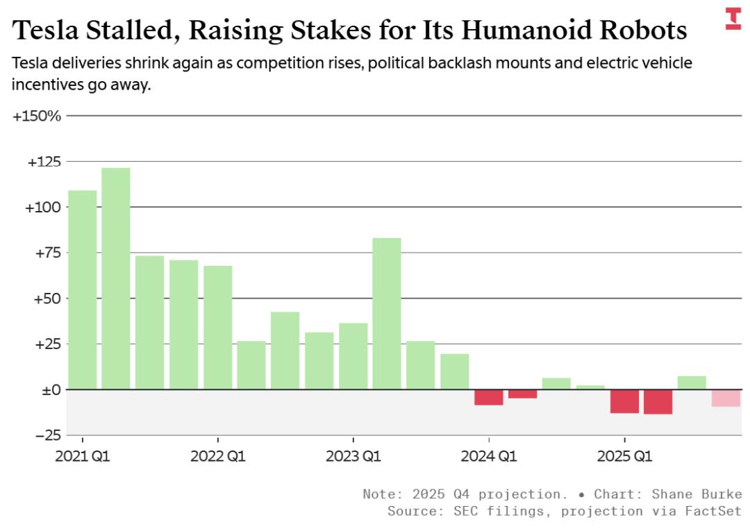 2021–2025年间,特斯拉汽车交付量同比增速持续放缓,2024年后转为负增长。