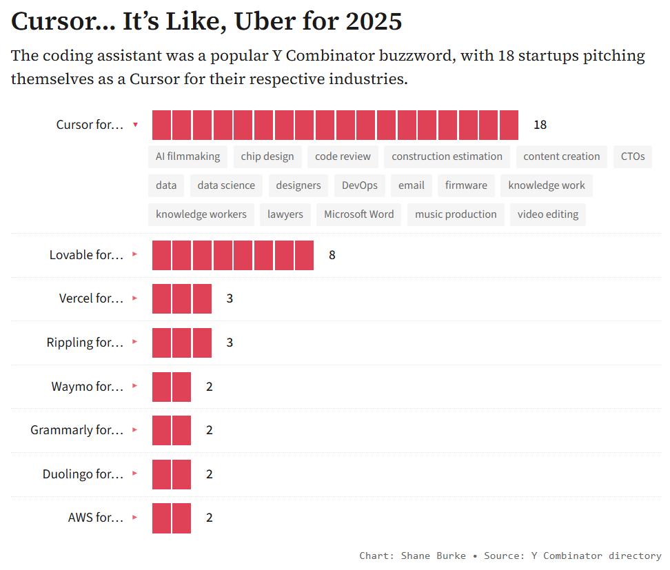 2025年Y Combinator创业营里,「某某行业的Uber」已成过去式,取而代之的是「某某行业的Cursor」。