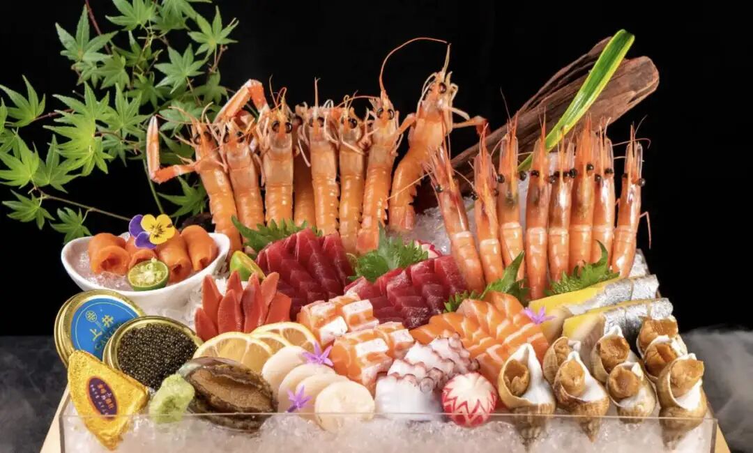 小小的绿叶早已是日料店的常见元素,寿司郎的多款寿司都有它的身影,且位置灵活多变。爆盛甜虾、红虾、海湾贝及冬日限定银鳕鱼西京烧等,会在食材下垫上绿叶;经典刺身组合7品则先铺绿叶再放刺身,衬得食材更鲜亮。