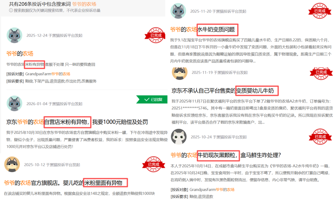 在黑猫投诉平台上,关于爷爷的农场的投诉多与食品安全和质量相关。
