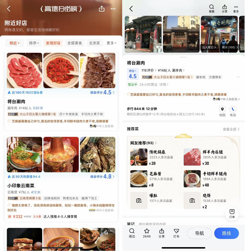 更关键的是,这些不同场景之间可以无缝衔接。比如,用户打开高德App,可以根据实时位置,查看扫街榜上的美食推荐,有了心仪目标后,直接就能打车前往。