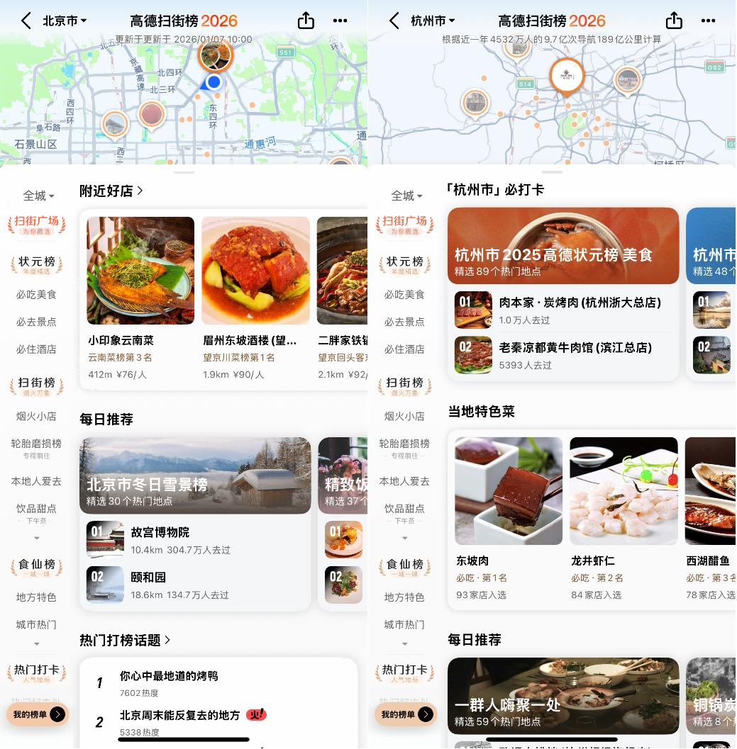 一年四季,每个区域都有当下的时令特色,例如北方的秋叶、冬天的雪,这些都是用户在此时此刻所需要的。而扫街榜想要还原的,正是用户最本质的生活节奏。目前,高德扫街榜2026已生成约6553个时令榜单。
