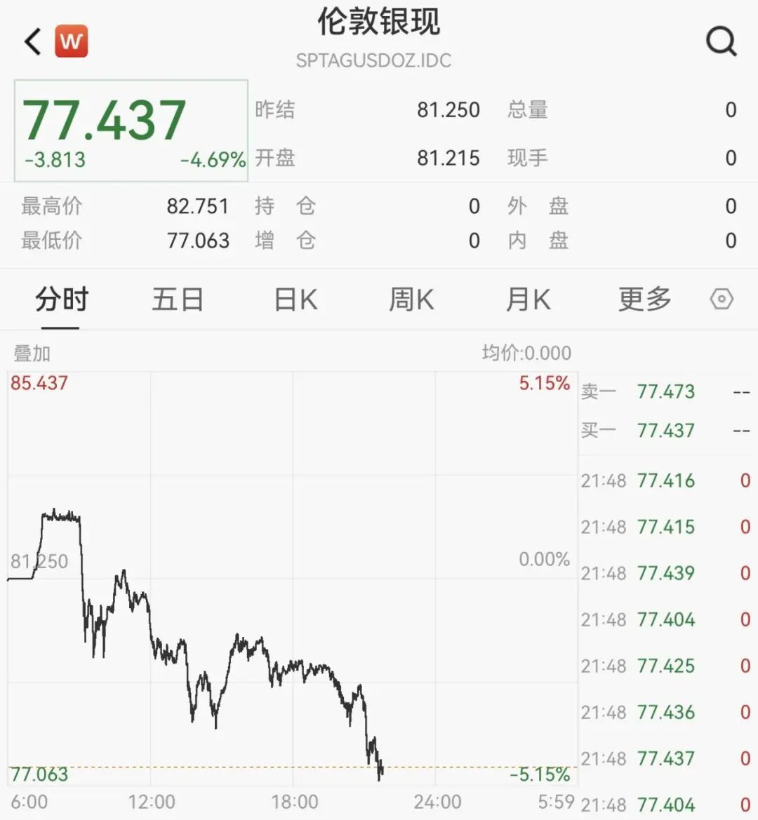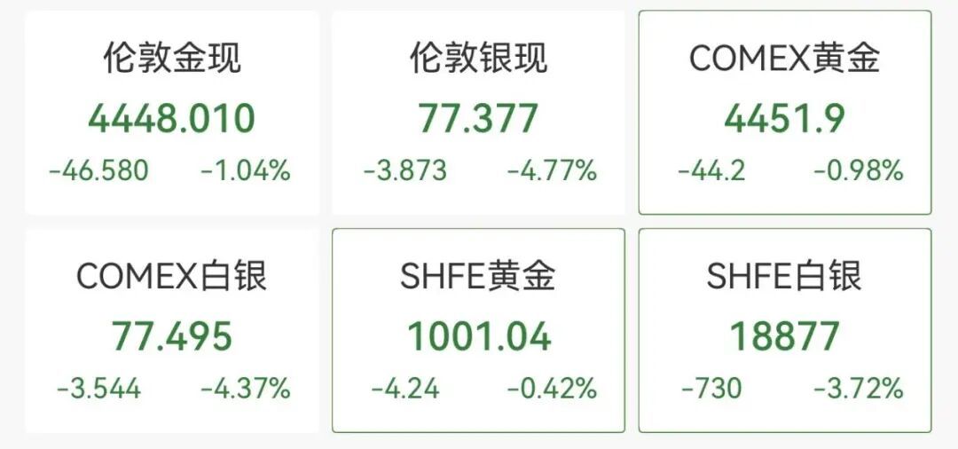 从现货市场来看,白银价格在突破80美元/盎司的关口后,今日出现短线回落,当前报价为77.44美元/盎司,日内跌幅达4.69%。