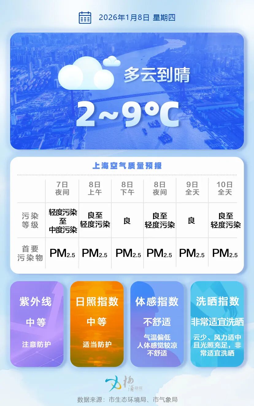 昨日晴冷模式开启,上海多个郊区发布了低温和霜冻预警信号。今日受弱冷空气扩散影响,早晚依旧寒冷,市区最低气温约2℃,郊区在-3℃至0℃之间,伴有薄冰或冰冻。白天升温速度缓慢,预计最高气温仅9℃左右,体感偏冷。