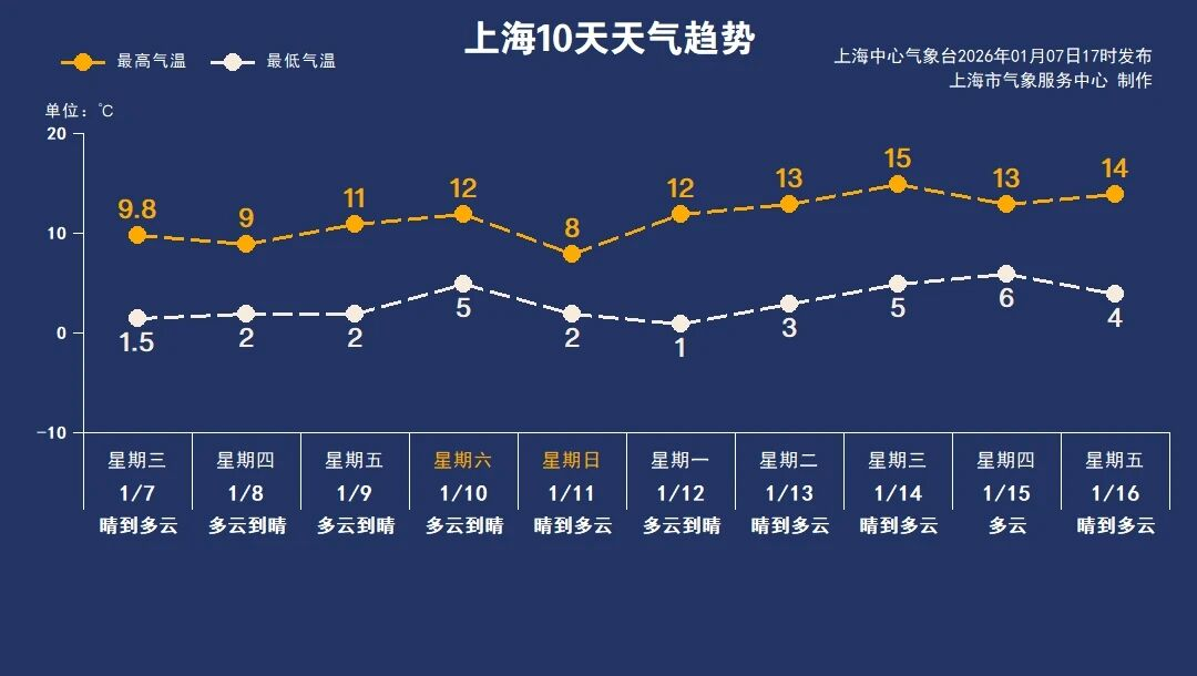 未来一段时间,上海将连续出现晴或多云天气,阳光充足,但回暖过程一波三折。周五和周六气温稍有回暖,最高气温11~12℃左右;周日新冷空气来袭,最高气温回落至8℃,同时风力增大。下周冷空气活动减弱,白天最高气温有望维持在12℃以上,但受晴空辐射降温影响,早晚寒意仍浓,需注意防寒保暖。此外晴多雨少,要注意用火用电安全。