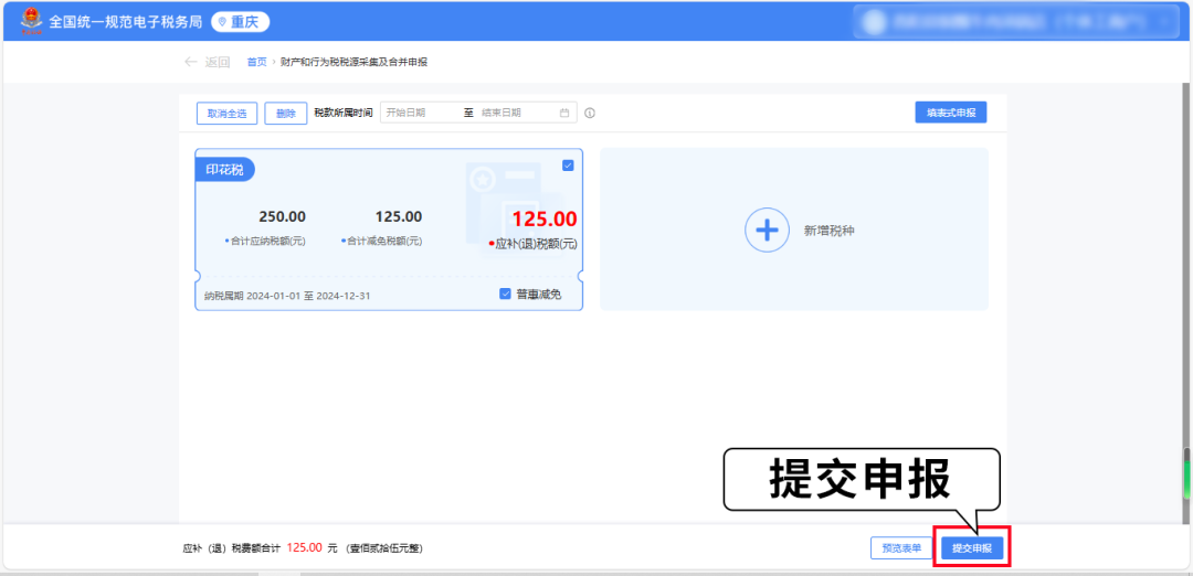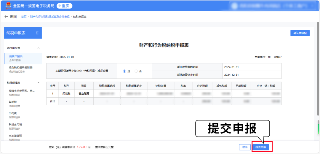 在【财产和行为税税源采集及合并申报】界面,系统会自动带出本期应申报的营业账簿印花税数据,核对无误后点击【提交申报】,确认信息后点击【确定】完成申报。