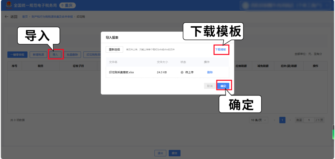点击【导入】-【下载模板】,按要求填写模板后上传,点击【确定】即可完成采集,注意事项与单笔录入一致。