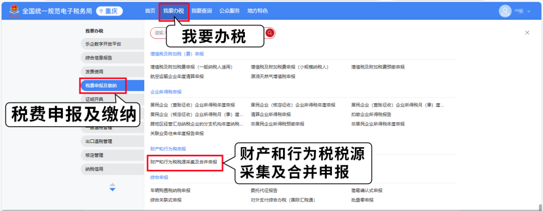 以“企业业务”身份登录电子税务局,在首页依次点击【我要办税】-【税费申报及缴纳】-【财产和行为税税源采集及合并申报】。