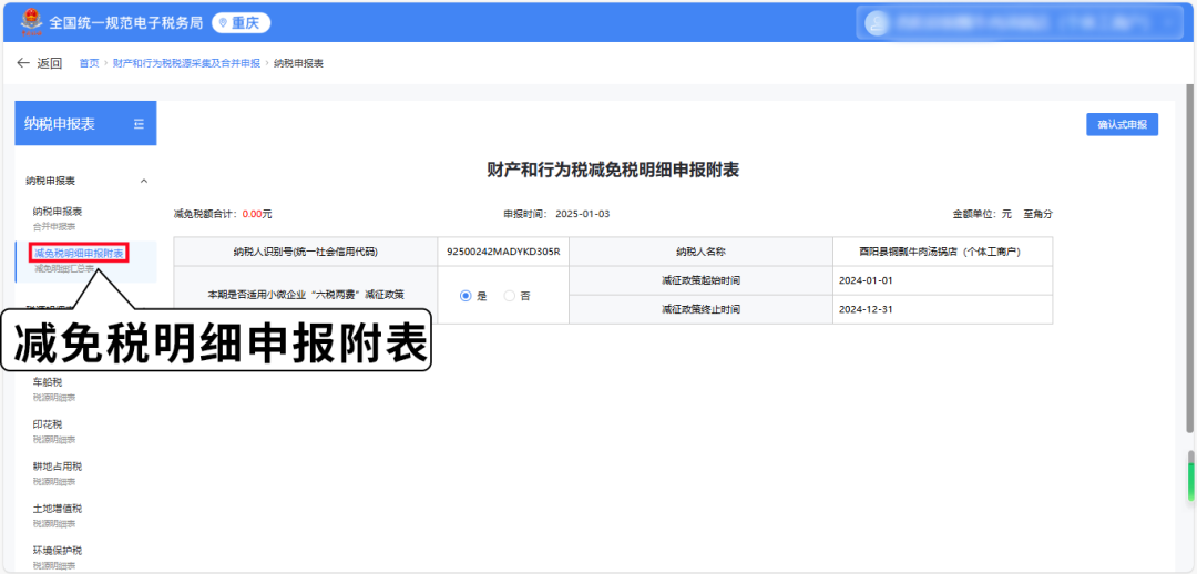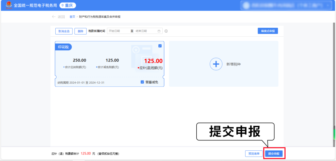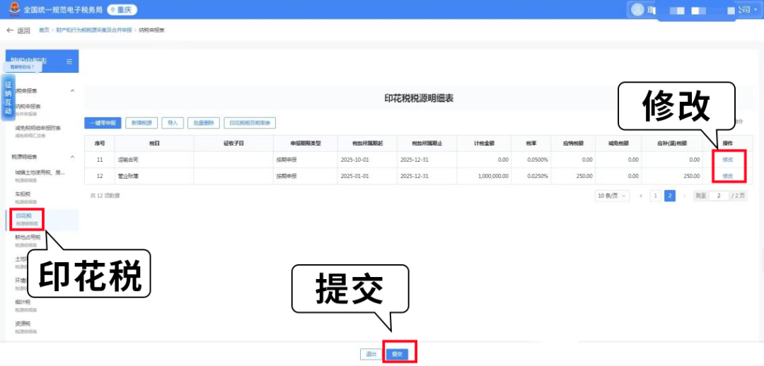 点击【填表式申报】,选择【印花税】税源明细表,选定对应税目后点击修改,填写计税金额并【提交】;再选择【减免税明细申报附表】,确认系统自动带出的减免信息无误后,点击【提交申报】并确认信息,完成申报。