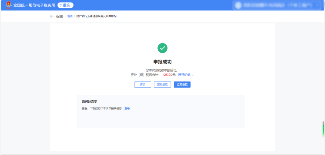 申报成功后,点击【立即缴款】,按提示完成税款缴纳。