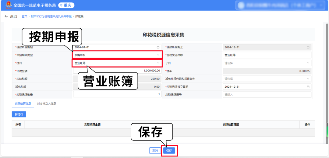 点击【新增税源】,在【印花税税源信息采集】页面逐条录入信息,点击【保存】并【提交】,完成采集。需注意:【申报期限类型】选“按期申报”,【税目】选“营业账簿”,其余栏次如实填写。