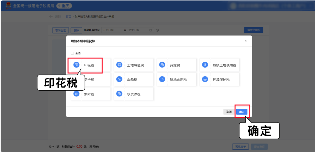 1.点击【新增税种】,选择【印花税】后点击【确定】。