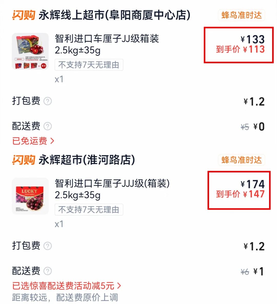 永辉超市里的智利车厘子价格也同样“亲民”。JJ级车厘子(五斤装)和JJJ级车厘子(五斤装)的售价分别是133元和174元,如果通过外卖平台购买,价格还会更低。