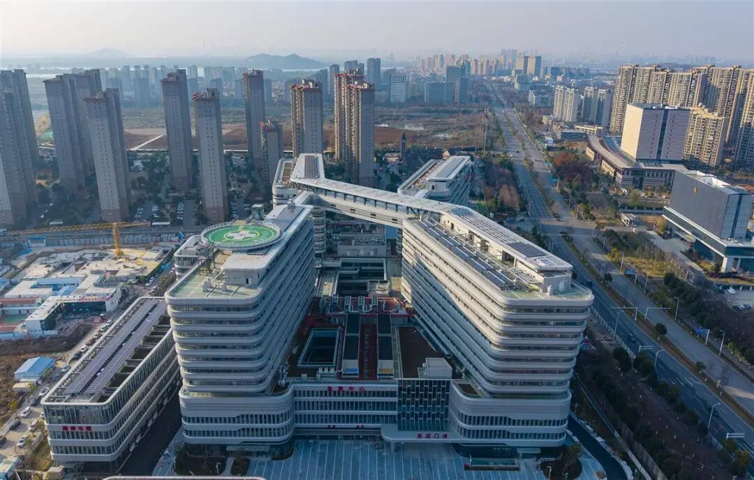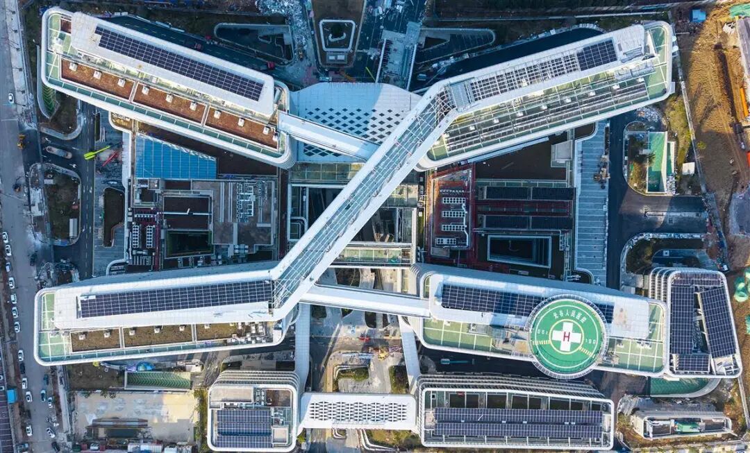 作为武汉东湖高新区重点民生工程,光谷人民医院坐落于花山生态新城核心区域,总建筑面积约24.4万平方米,规划设置床位1000张。项目涵盖4栋住院楼、2栋综合医疗楼、行政楼、发热门诊以及立体停车楼等设施,屋顶还配备了停机坪,为紧急医疗救援提供有力保障。