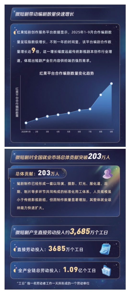 以編劇為例,紅果短劇創作服務平台數據顯示,2025年1-9月合作編劇數量呈指數級增長,不到一年增長近9倍,遠超傳統影視劇本創作行業增速。業內人士表示:“微短劇通過規模效應擴大就業容量,激活了傳統影視行業因項目斷檔而閒置的人力資源,讓編劇、攝影師等從業者實現‘有活幹、有錢賺’的良性循環。它已成為吸納青年群體、靈活就業人員及傳統影視溢出人才的重要蓄水池,既為專業人才提供舞臺,也為勞動者帶來收入來源和職業發展路徑。”