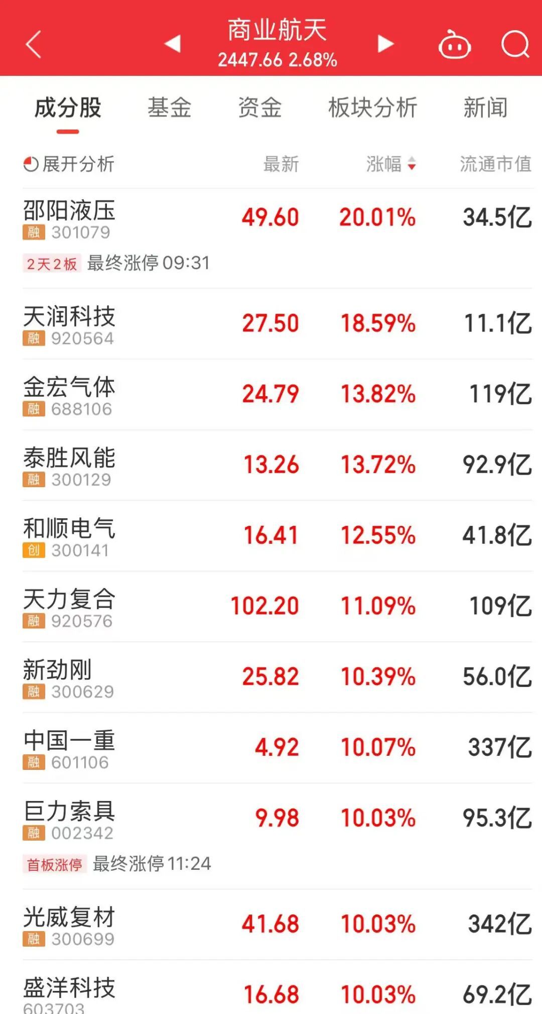商业航天板块中,邵阳液压、天润科技等个股涨幅较大。