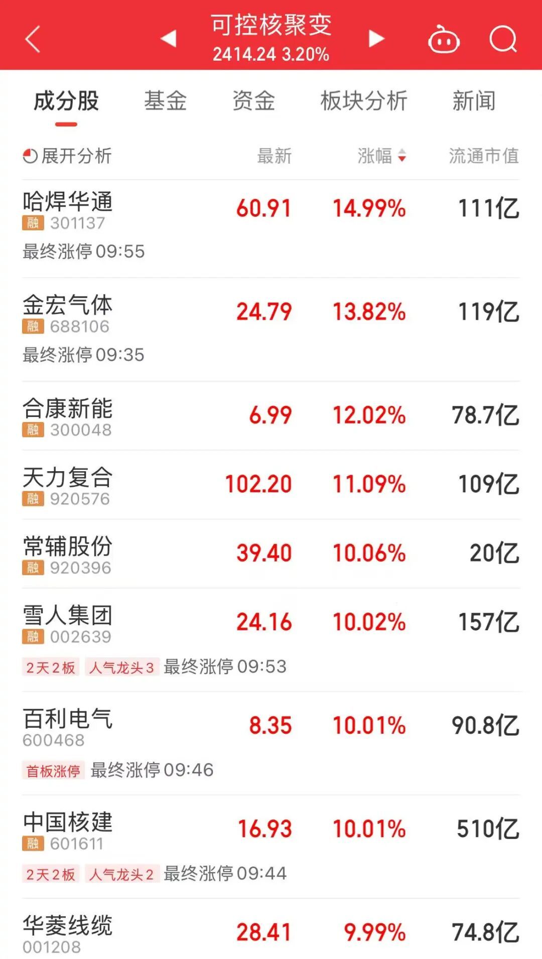 具体来看,可控核聚变板块中,哈焊华通、合康新能等个股涨幅显著。