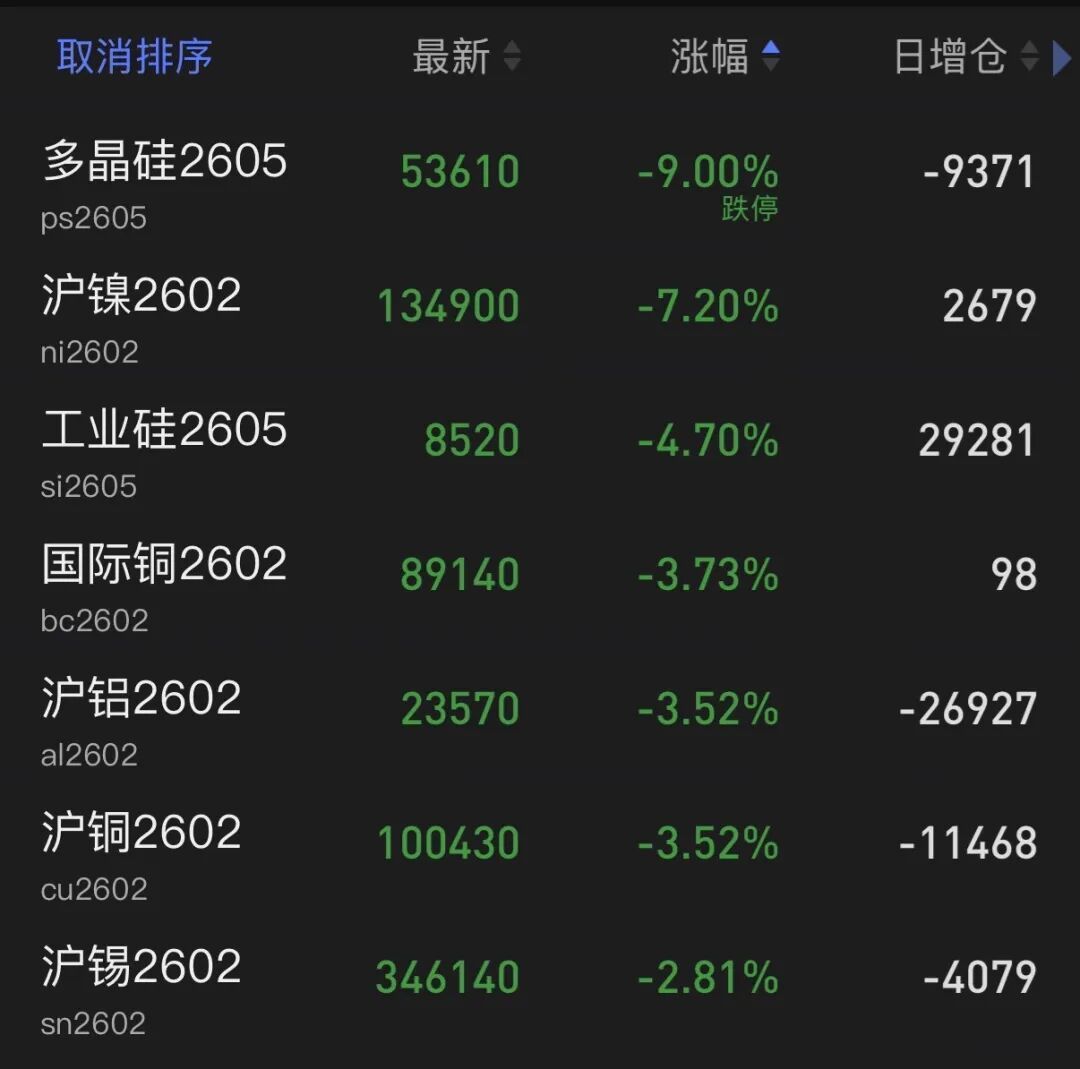 国内期货市场上,多晶硅主力合约遭遇跌停。沪镍主力合约跌幅超7%,工业硅跌幅超4%,沪铝、沪铜、沪锡等其他金属品种也纷纷出现大幅下跌。