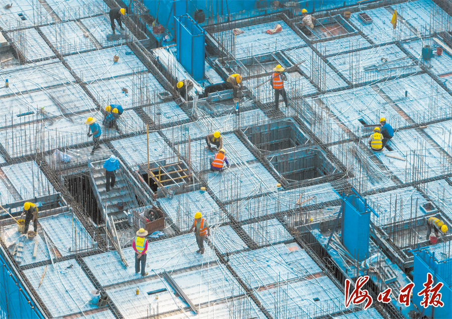 项目现场工人绑扎钢筋(海口市融媒体中心记者 石中华 摄)