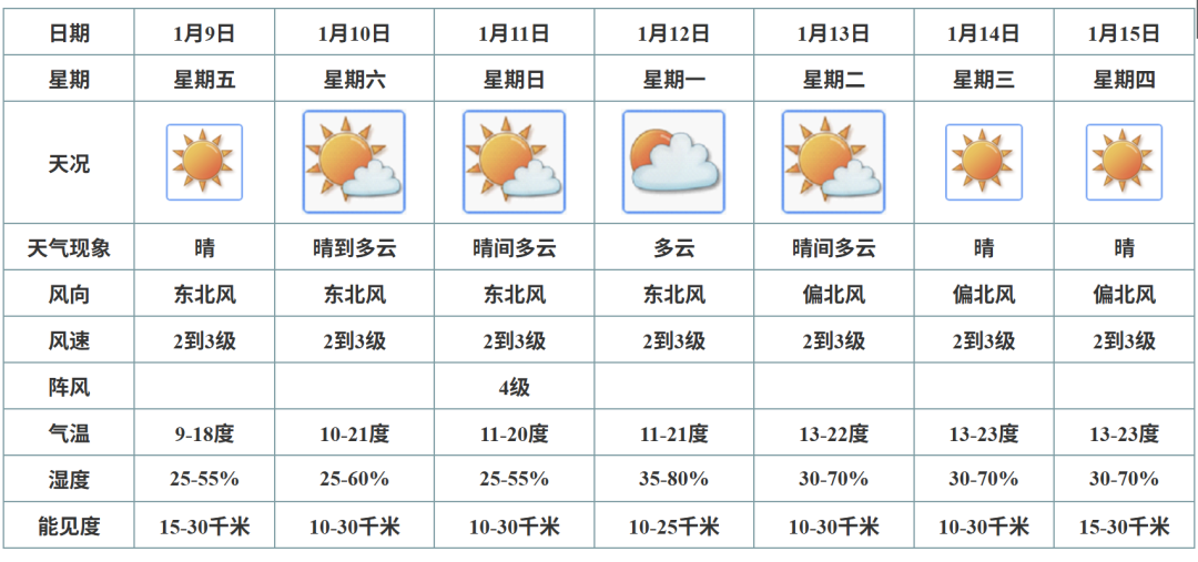 江门具体天气预报如下:预计9-11日,天气晴朗干燥,气温缓慢回升;12日受偏南气流影响,云量增多;13-15日晴间多云。目前全市森林火险红色预警信号正在生效,大家要注意森林防火以及家居用火用电安全。